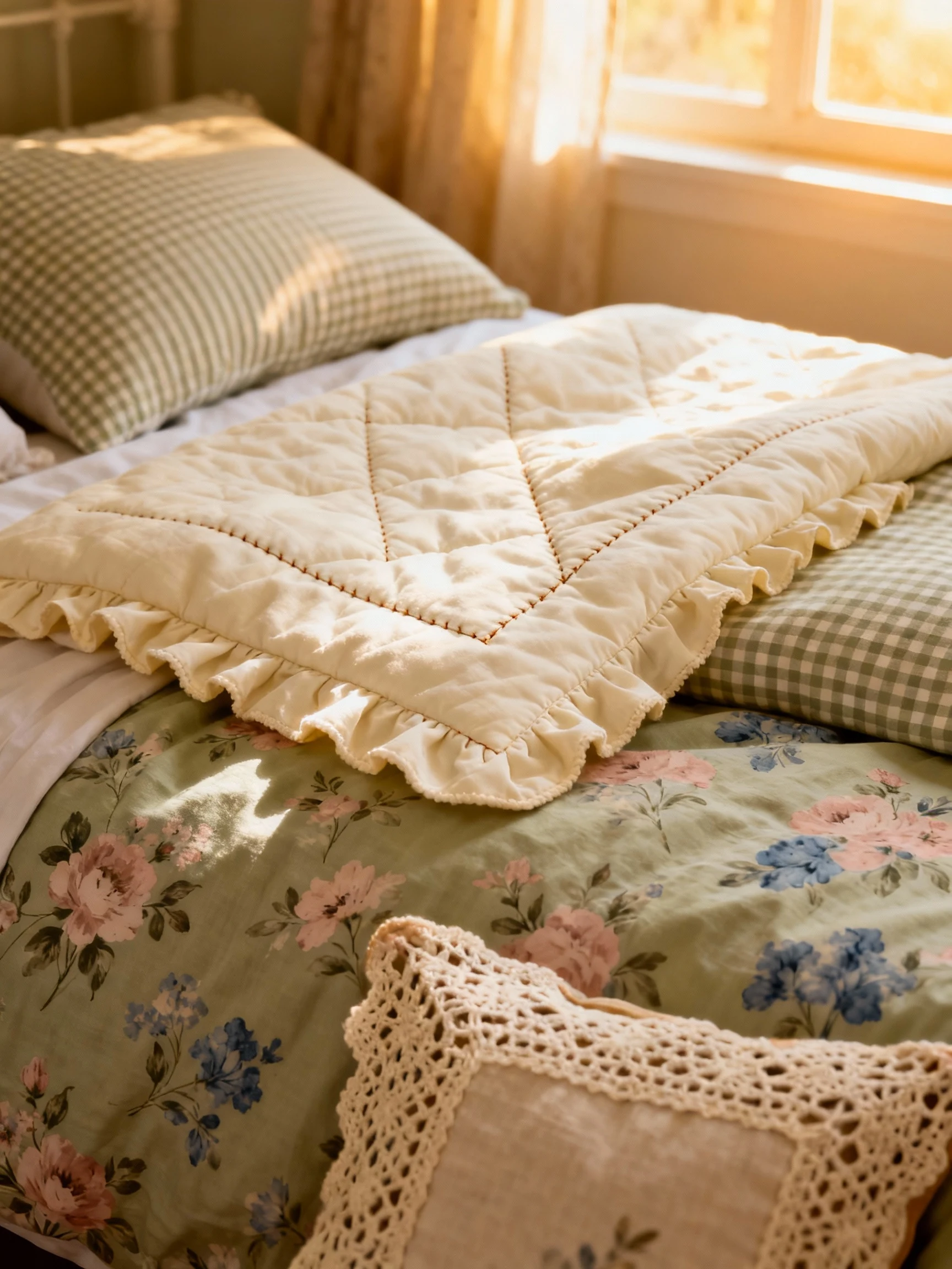 - Topper: a cream quilt with stitched detail or a lightly ruffled edge