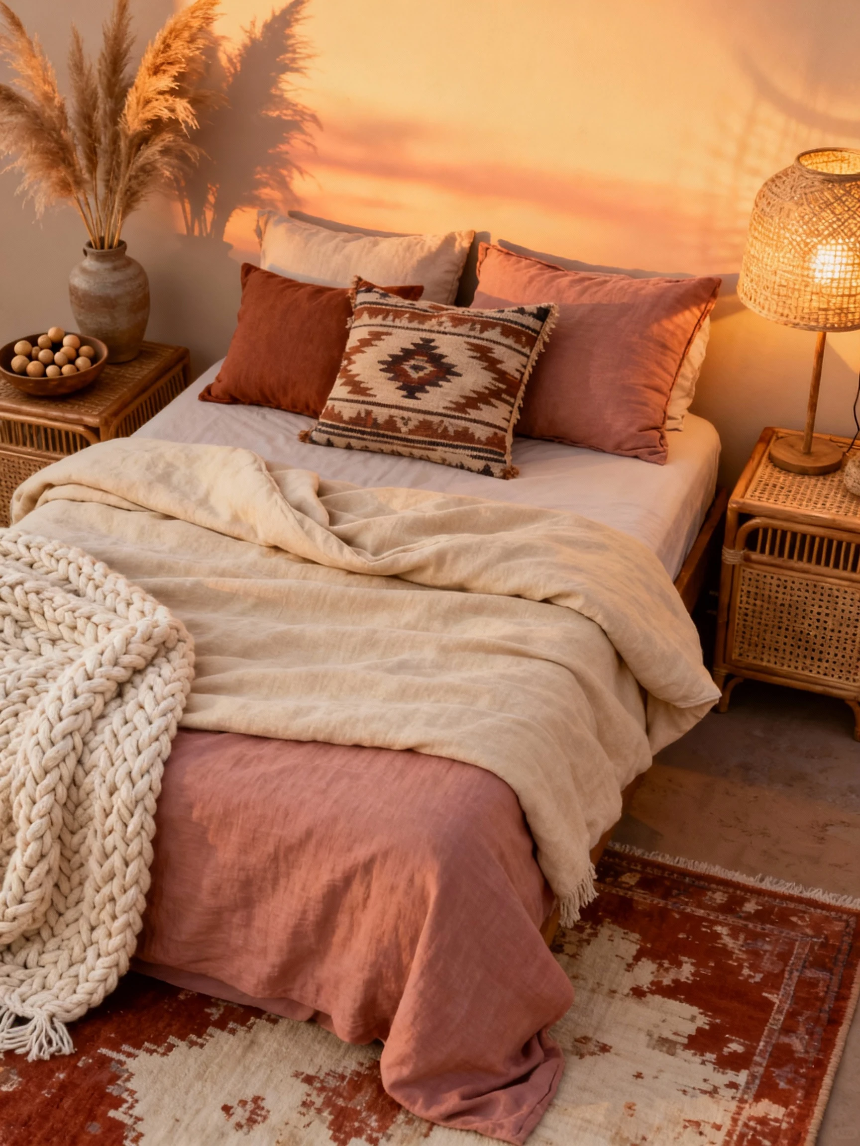 4. The Desert Sunset Boho: Terracotta Sheets, Woven Texture, And A Golden Hour Mood