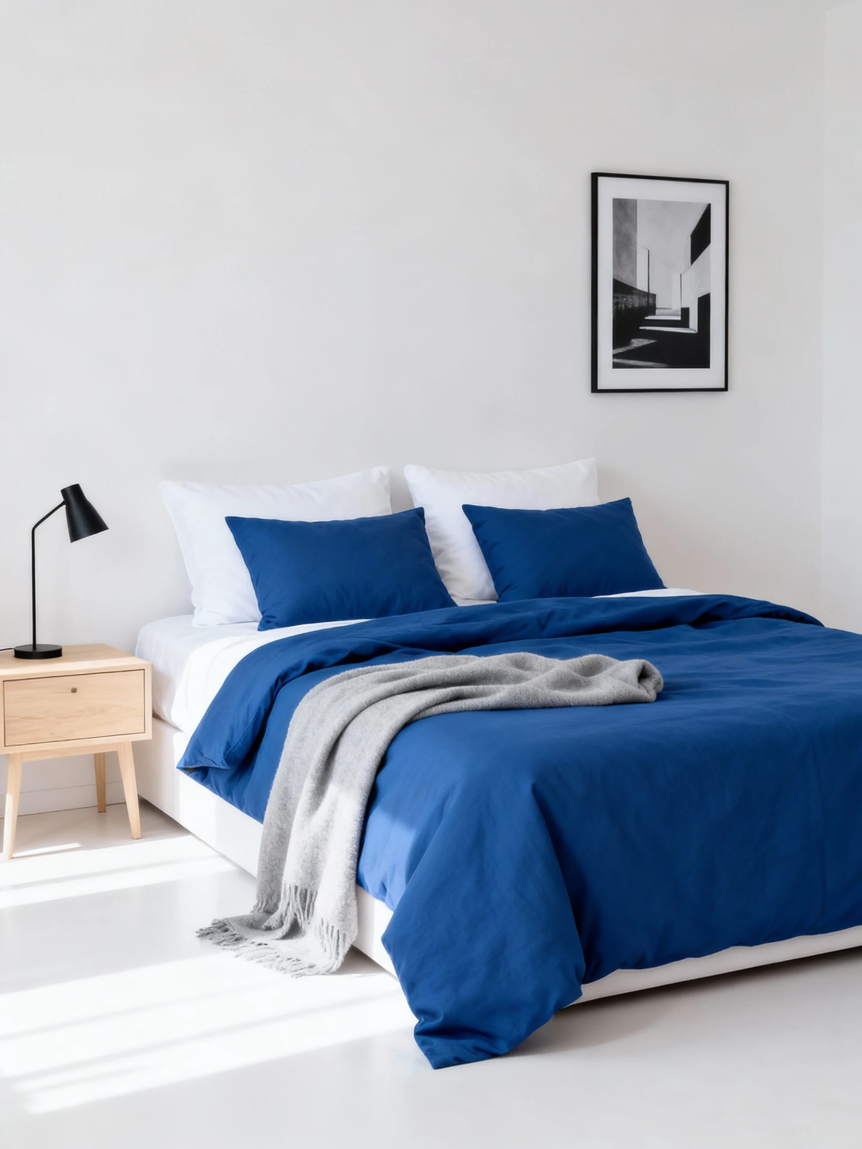 Add one graphic element like a black-and-white print, a modern wall clock, or a sculptural vase. And keep surfaces mostly clear so the color on the bed feels like the star.