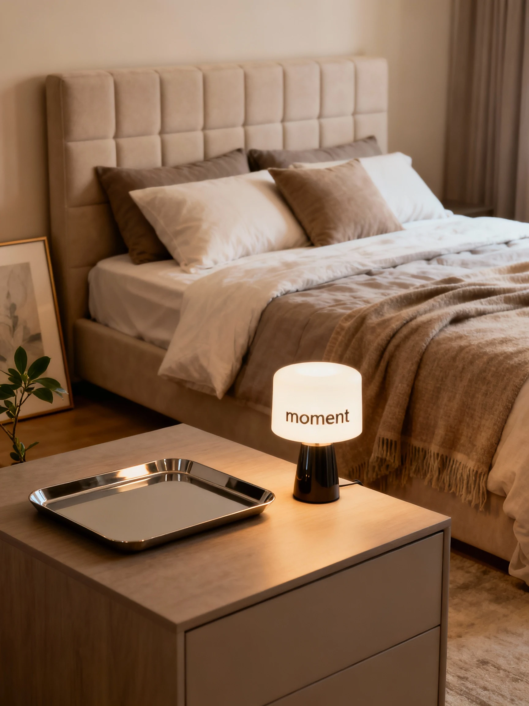 - Bedside vibe: one sleek tray, one candle, one book stack