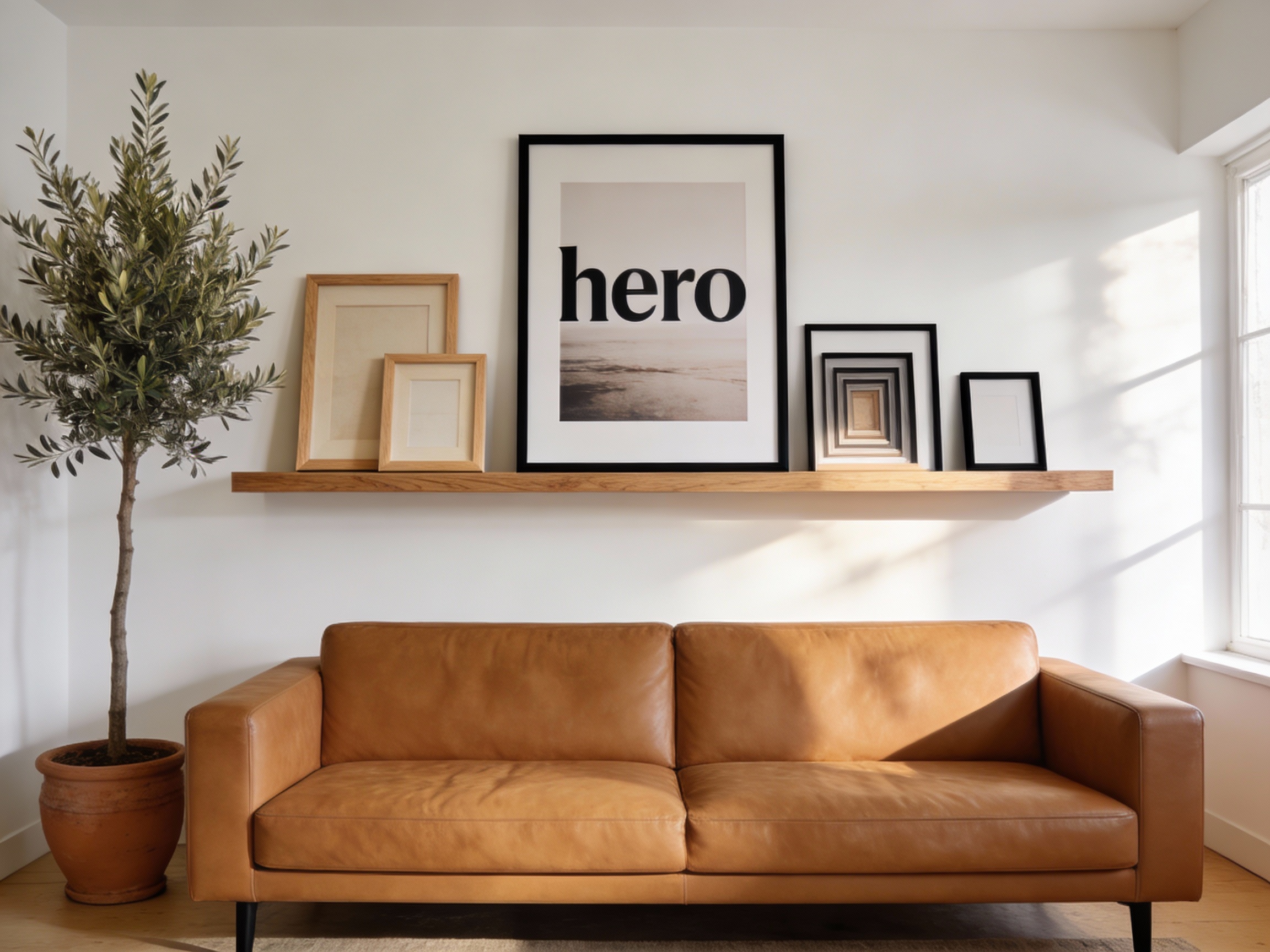 Finish the scene with textured throw pillows in oatmeal and rust, plus a tall olive tree in a clay pot. The frames don’t just decorate the wall—they set the whole room’s tone: warm, modern, and lived-in.