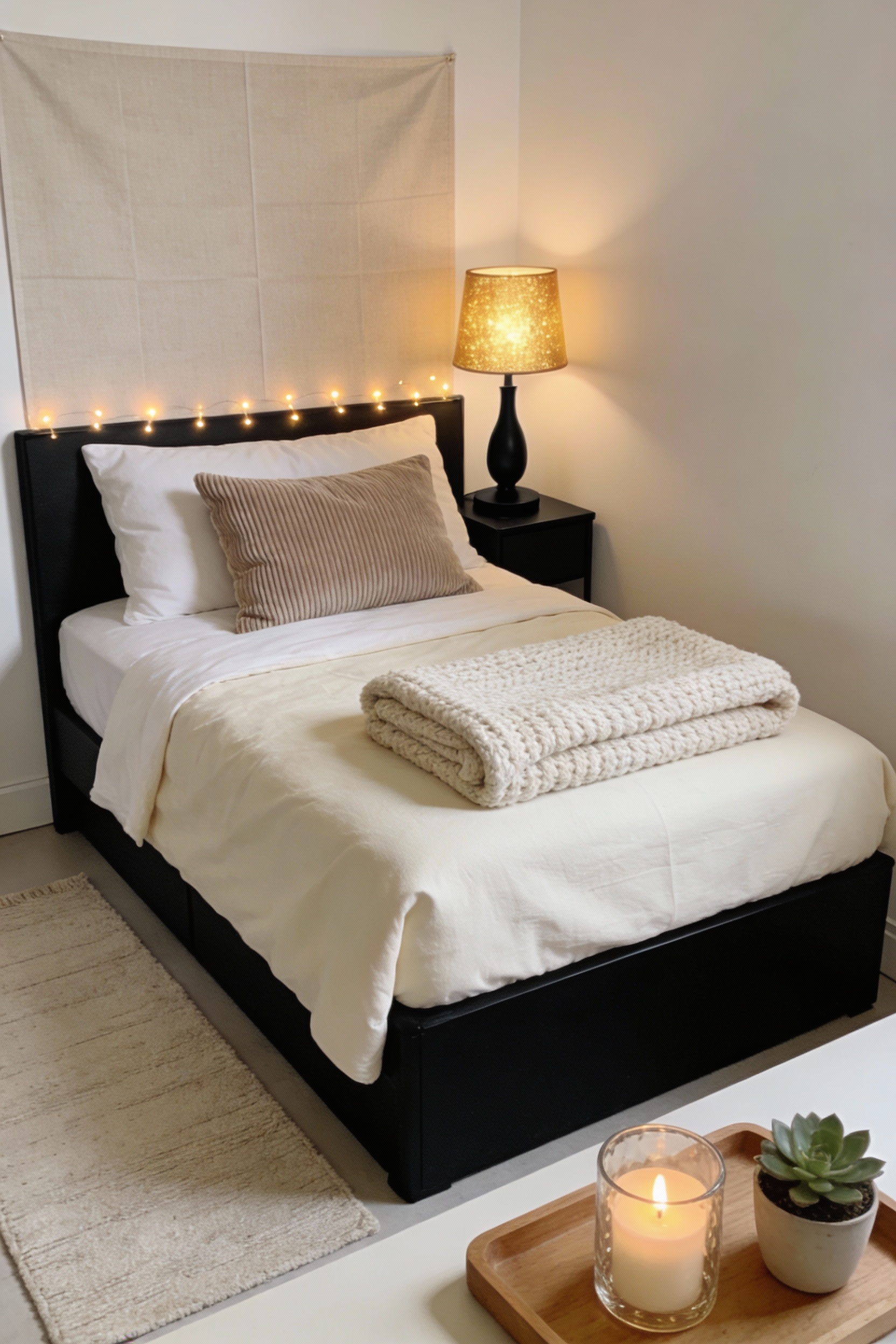 Now for the “hotel trick” that changes everything: lighting. Swap harsh overhead vibes for a warm bedside lamp or clip-on reading light, plus fairy lights tucked behind your headboard area for glow, not glare.