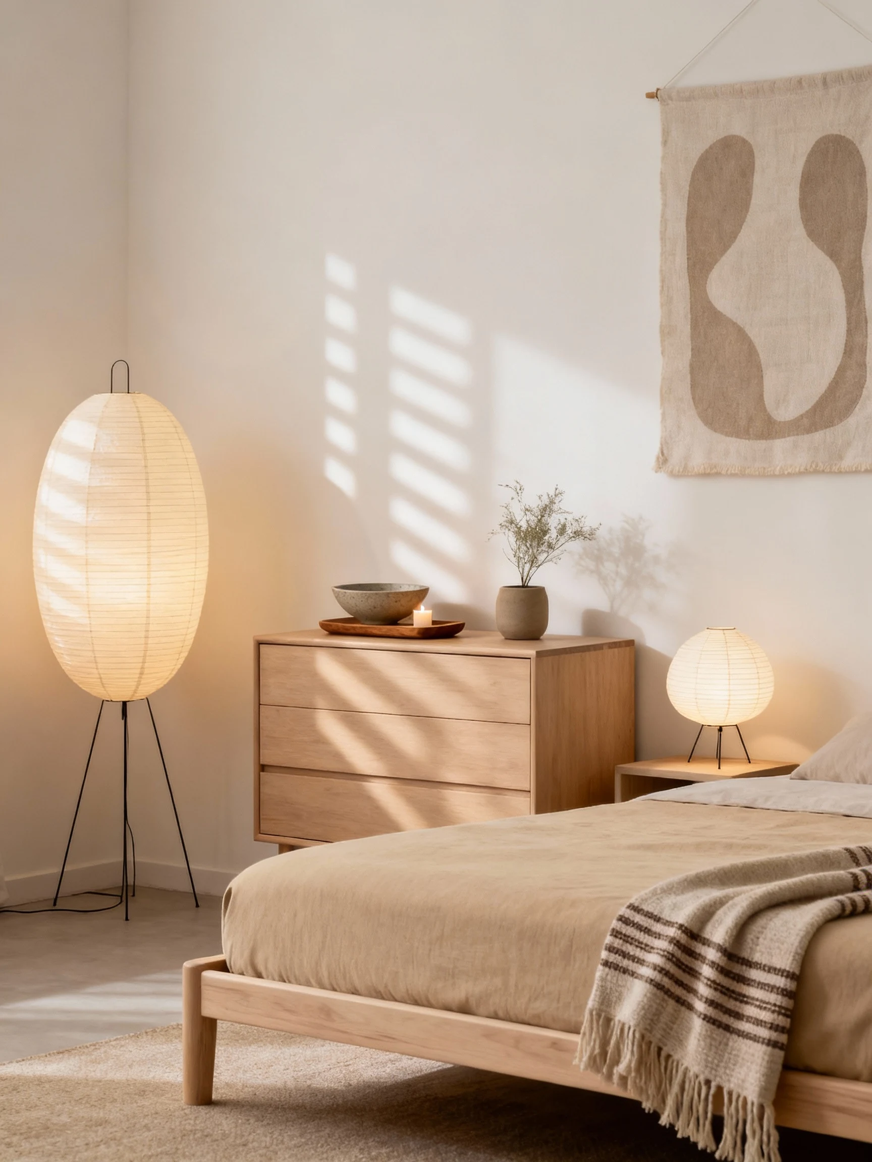 2) The Hanji Glow Corner: Paper Lamps, Natural Wood, Soft Shadow Play