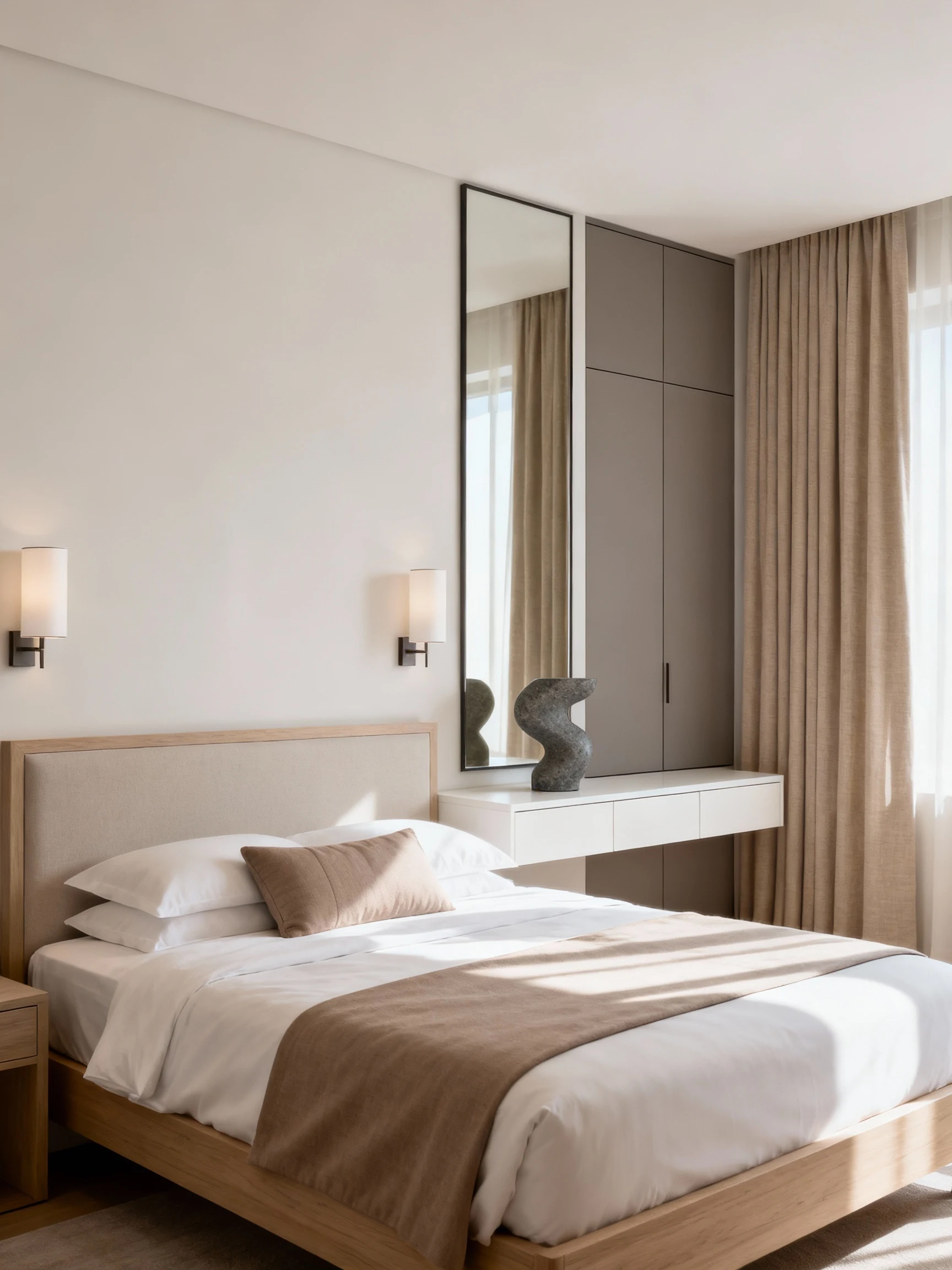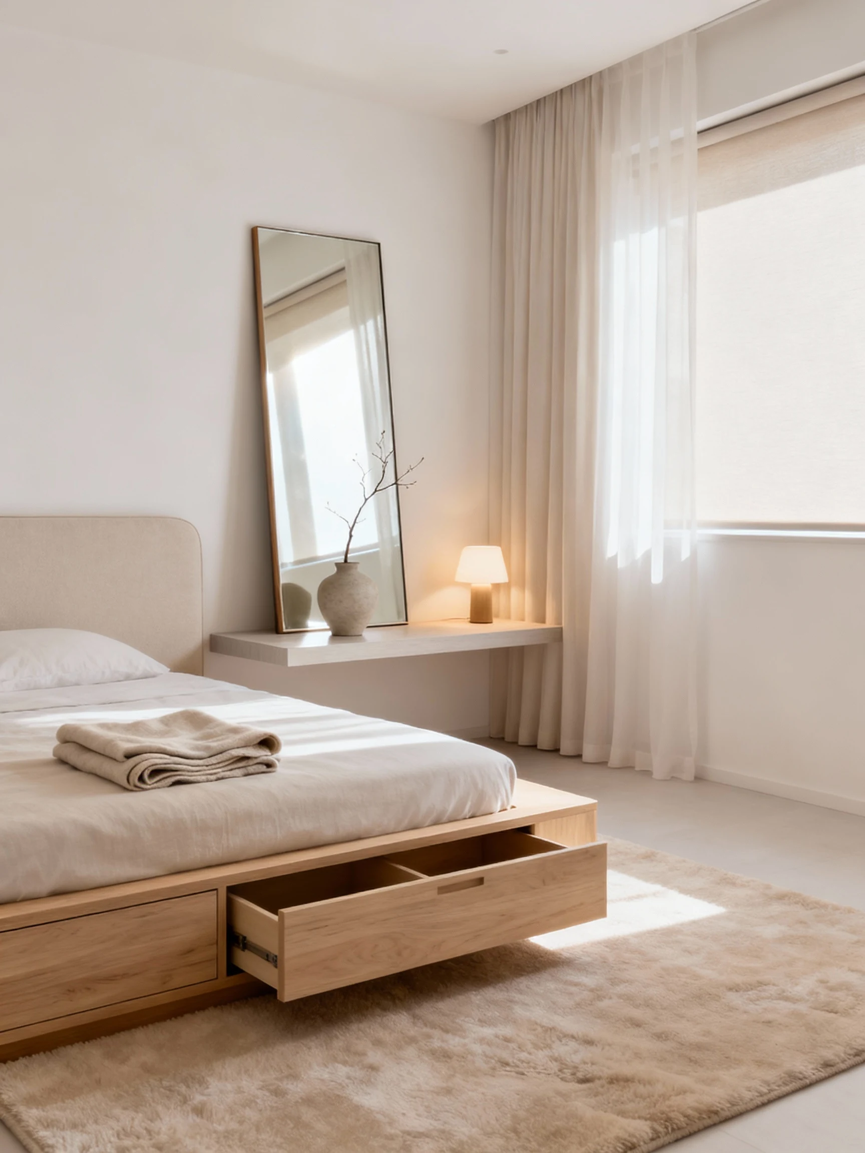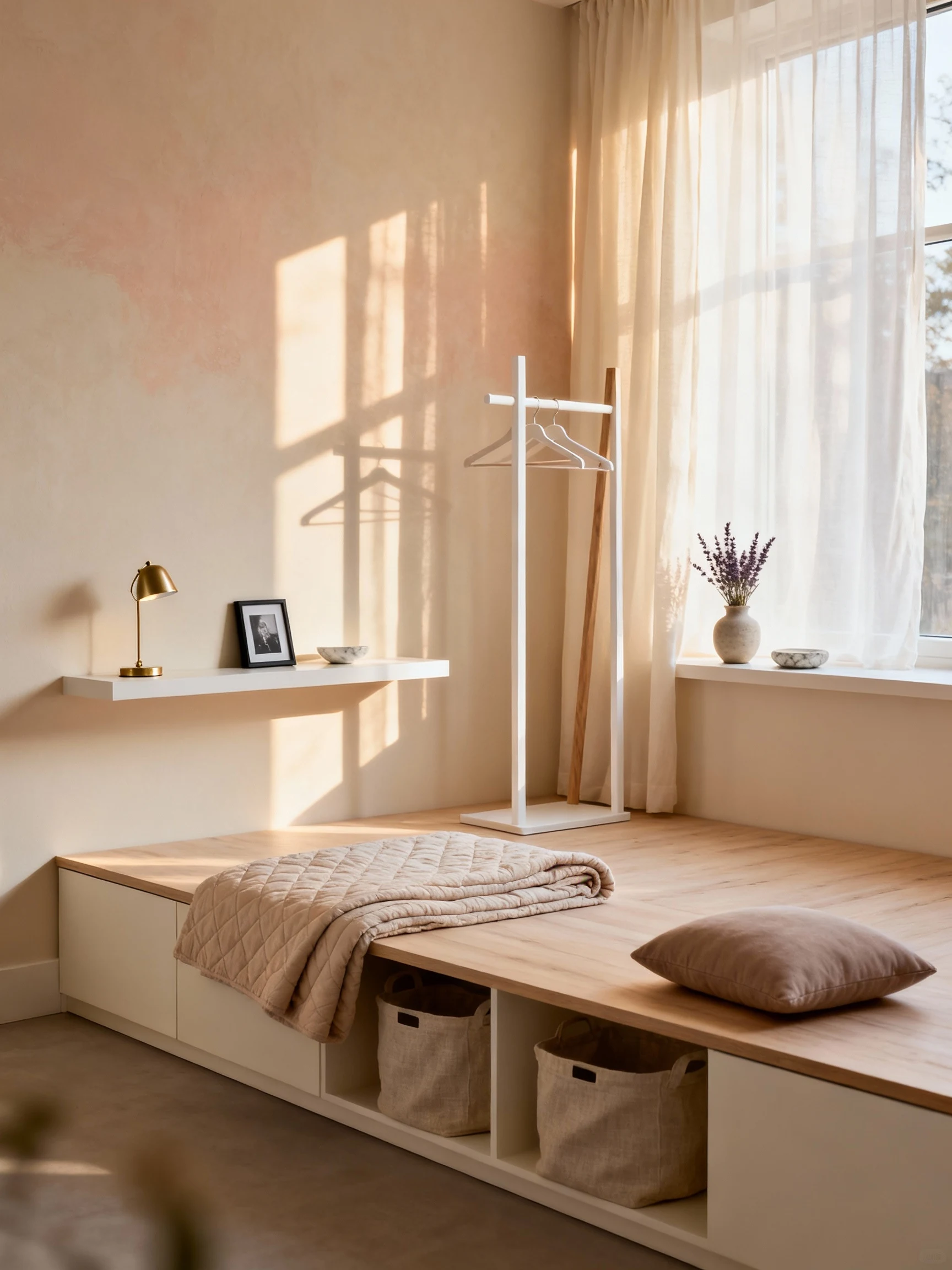 5) The Sun-Washed Studio Bedroom: Light Beige Walls, Soft Minimal Shelves, Airy Styling