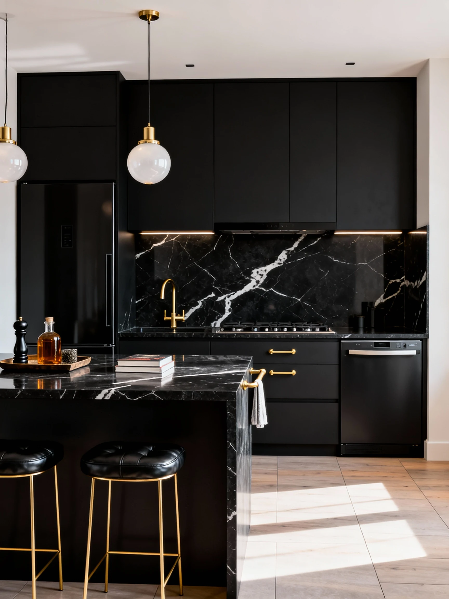 - Color palette: matte black, charcoal, white veining, warm brass
