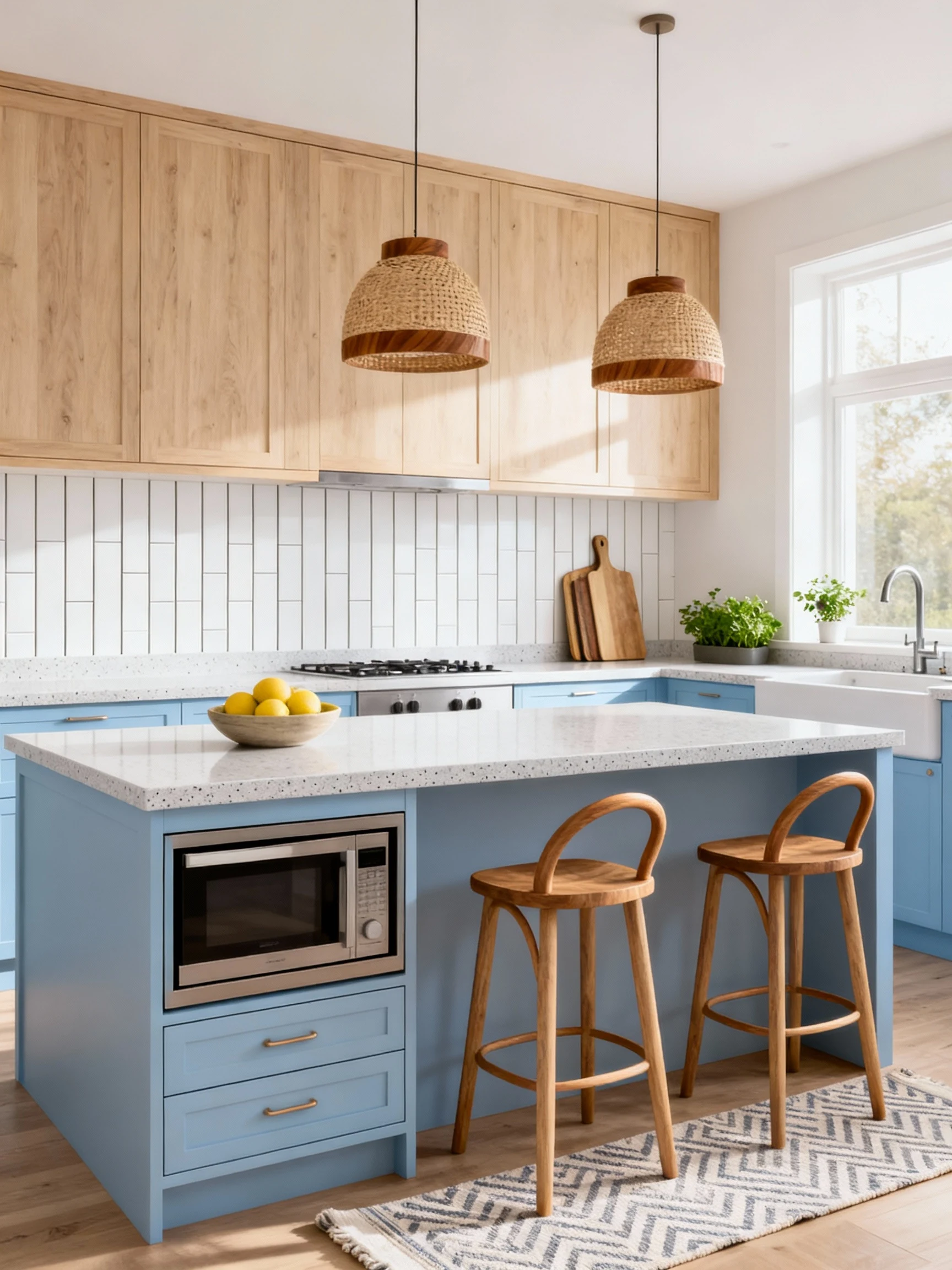 - Lighting: woven or wood-accent pendants for warmth