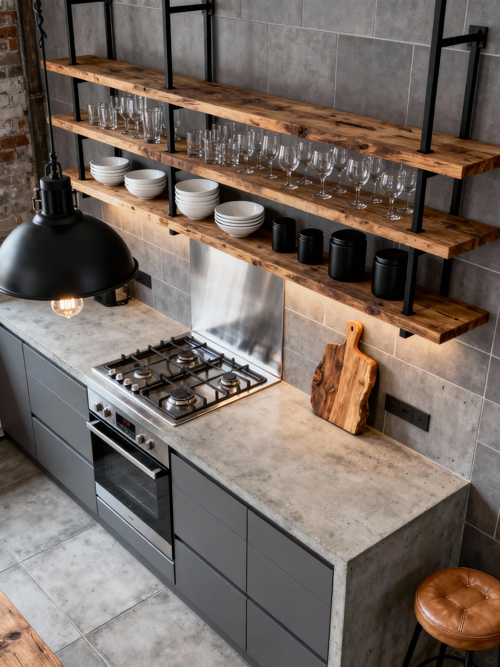 The backsplash is where you can have fun. Large-format gray tile, a brushed metal panel behind the cooktop, or even a dark grout brick-look tile gives that industrial edge without turning it into a movie set.