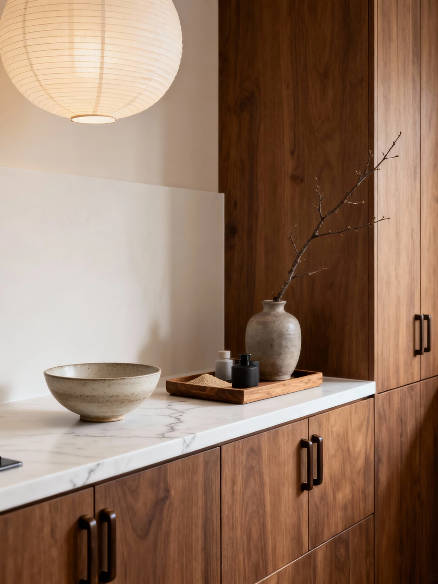5) The Japandi “Walnut, White, And Zen” Serenity Kitchen