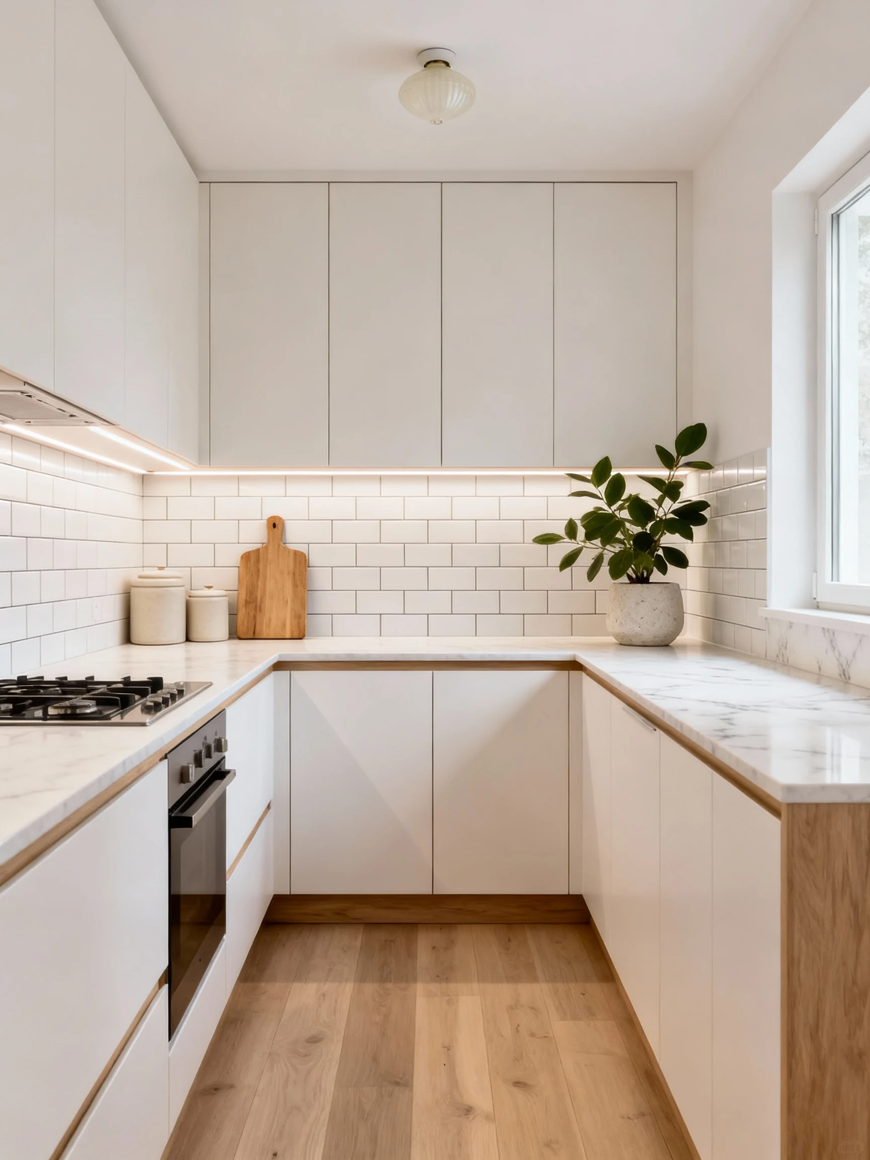 The countertops should be pale and clean, like a crisp white quartz or a light gray with tiny speckles. For the backsplash, go for classic elongated subway tile or slim vertical tile in white, with a light grout to keep it seamless.