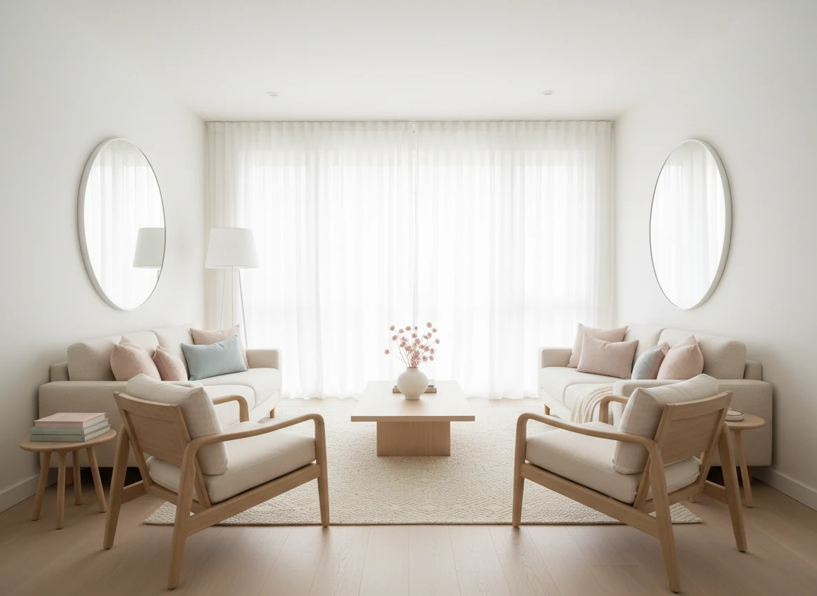 Picture pale wood floors, crisp white walls, and furniture kept low and clean-lined. Add pops of muted pastels in throw pillows and a cozy wool rug. Keep every surface clutter-free—less really is more here.