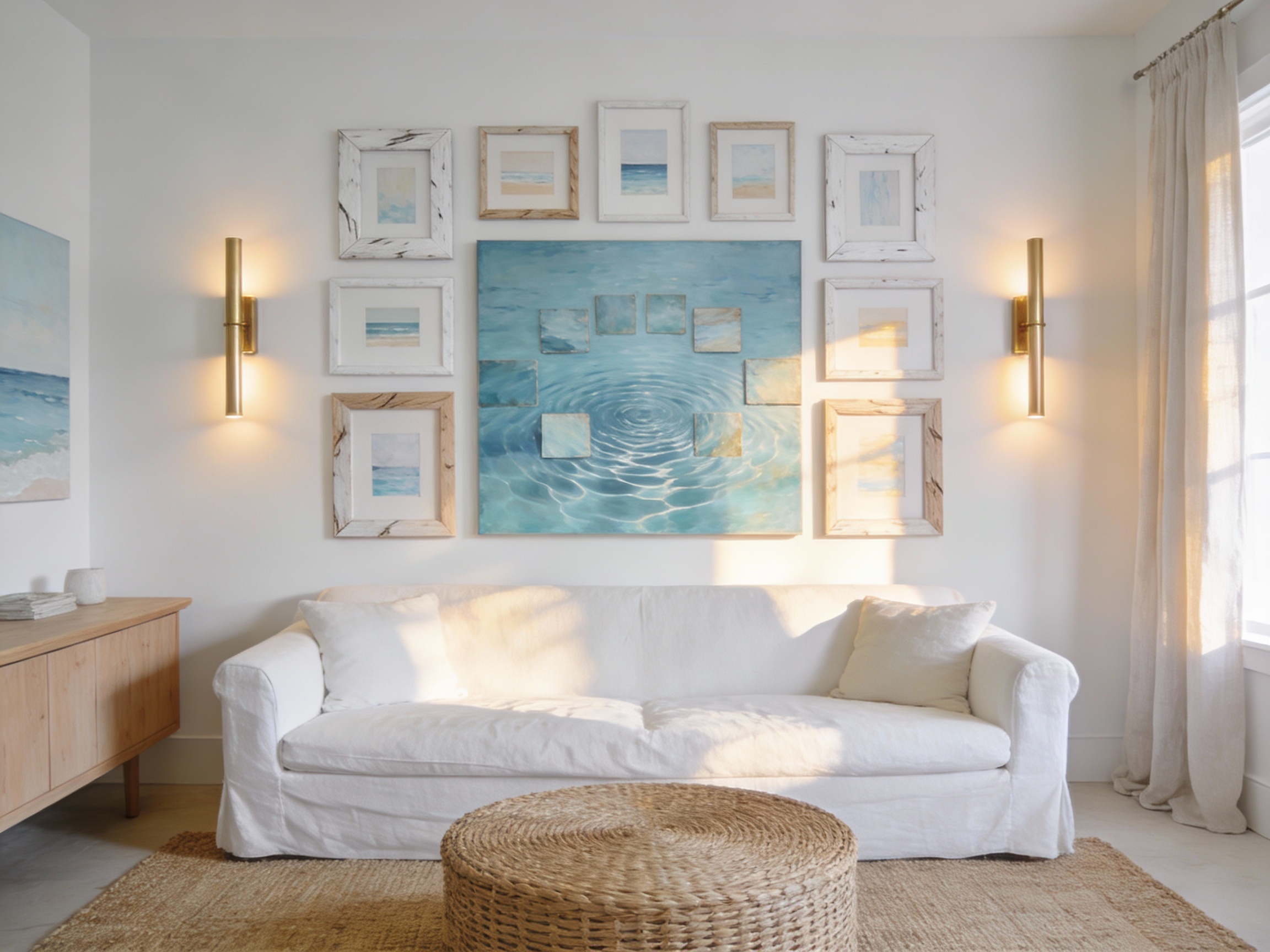 Layers matter here, so bring in textures with linen curtains and striped pillows that echo the gallery colors. A ceramic bowl of collected sea glass on the coffee table completes the story.